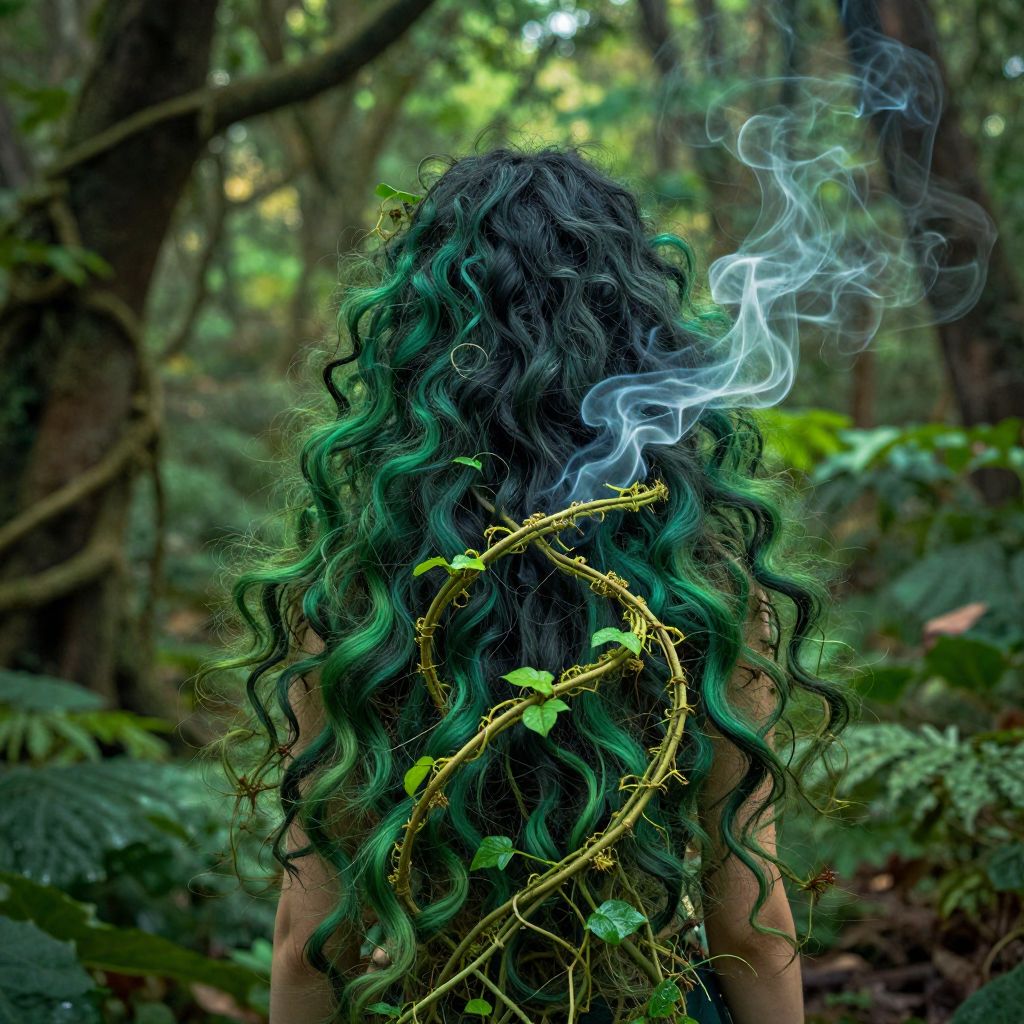 Photograph of a person with long, curly, green-tinted black hair standing in a dense forest. Their back faces the camera, revealing wavy hair intertwined with small, green leaves and thin, yellowish vines. A wispy, blue-green smoke trail rises from the right side of their head. The forest background is lush with green foliage, ferns, and blurred tree trunks, creating a mystical, enchanted atmosphere. The person's skin is not visible, and the image focuses on the hair and natural elements. The overall composition blends fantasy and nature, evoking a magical forest setting.