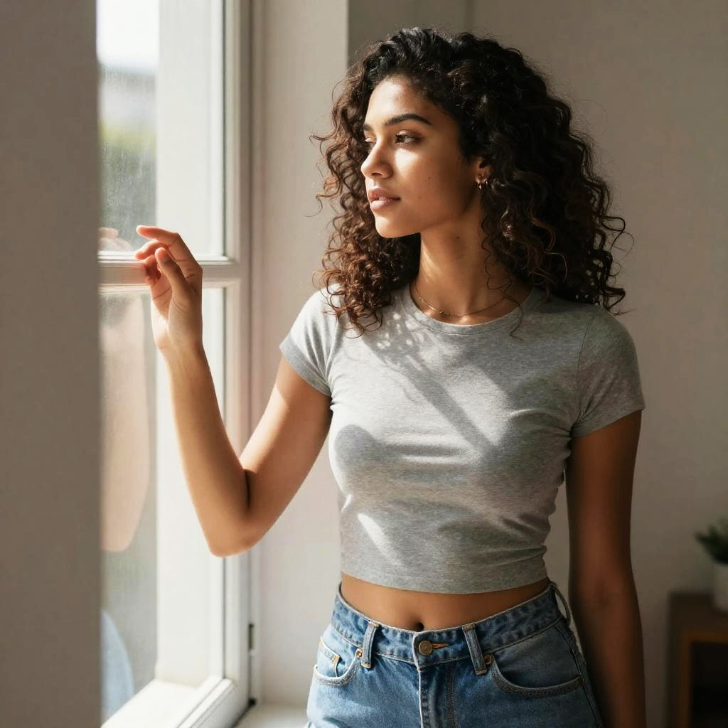 Photograph of a young woman with curly dark brown hair, standing by a sunlit window. She's wearing a tight, gray, short-sleeve crop top that reveals her midriff and high-waisted blue jeans. Her right hand rests on the window frame, and she gazes thoughtfully outside. The light creates soft shadows on her face and the wall behind her, adding a warm, natural glow to the scene.