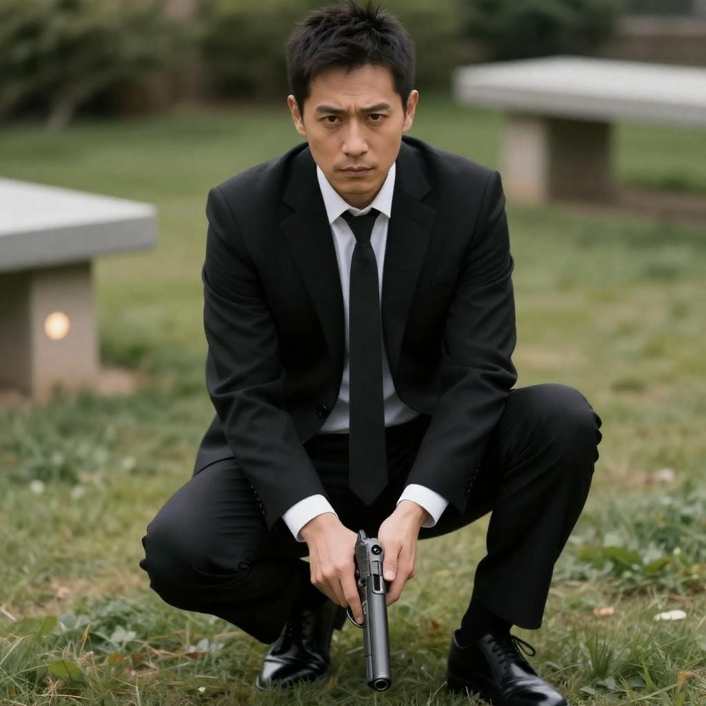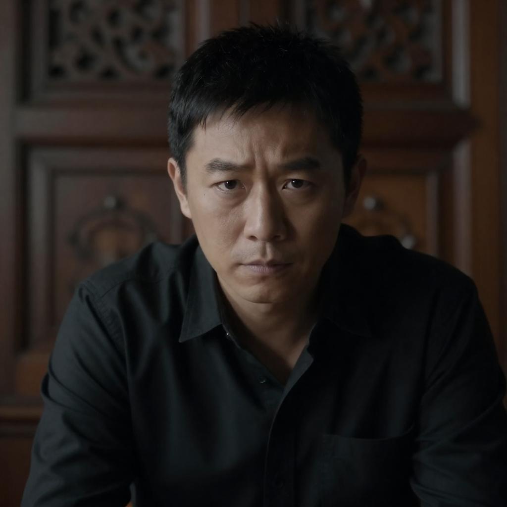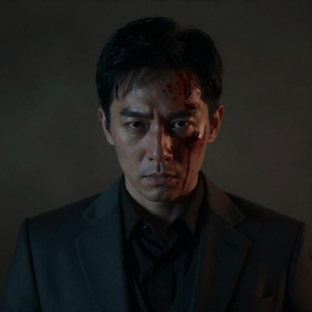 Photograph of a man with blood smeared across his face and dark hair, illuminated by a dim light. He has a focused, intense expression with blood on his nose and cheeks. He wears a dark suit, and the background is shadowy and indistinct. The image has a dramatic, dark atmosphere.