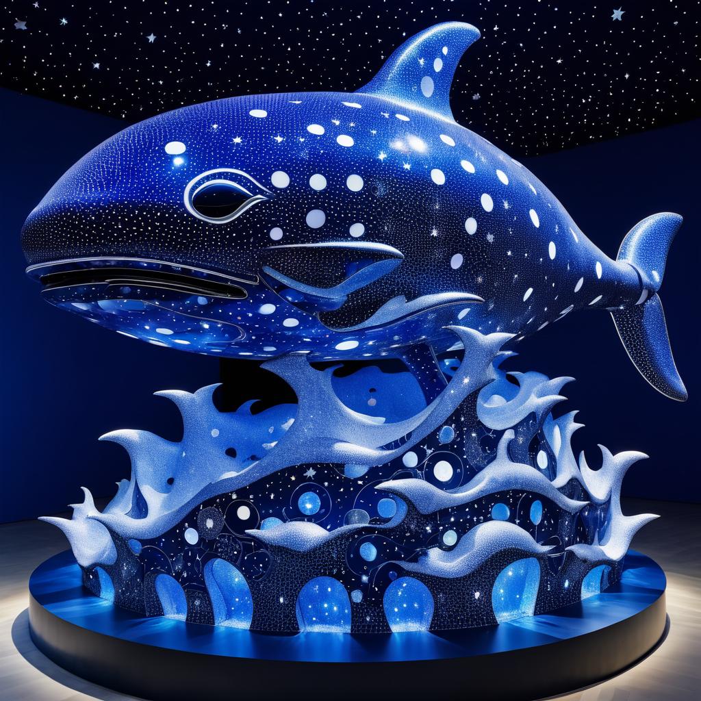 Detailed high-resolution image of a celestial whale sculpture featuring vibrant blue tones with white dots and starlight effects. The artwork is inspired by Yayoi Kusama and Takashi Murakami's styles, depicting a cosmic whale surrounded by abstract waves and stars on a dark blue backdrop. The sculpture showcases a captivating blend of surreal and celestial themes.