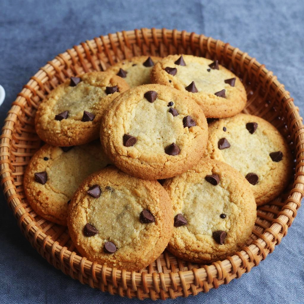 Photograph of a round, woven basket filled with golden-brown cookies, each studded with small, dark brown chocolate chips. The basket is centered on a blue, textured cloth background. The cookies have a slightly rough texture, indicating a homemade or rustic style. The lighting is bright, highlighting the cookies' warm, inviting colors and the basket's natural weave pattern.