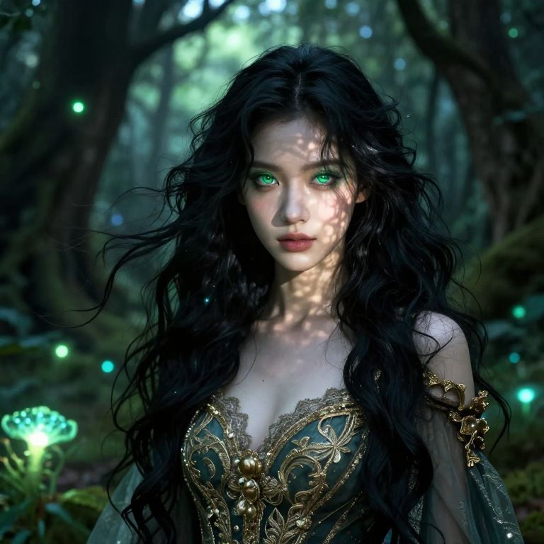 Envision a hyperrealistic portrait of an enigmatic enchantress with mesmerizing emerald eyes and cascading raven-black hair, gently flowing in waves. She is adorned in an ornate gown embellished with intricate gold embroidery and delicate lace, showcasing subtle glimpses of her skin as the fabric dances around her form. Set against the backdrop of a lush ancient forest, she stands at the threshold of a hidden glade illuminated by an otherworldly glow emanating from bioluminescent flora. This ethereal light casts soft shadows across her face, creating an atmosphere of enchantment and mystery. As we focus on this captivating subject, our perspective shifts to a 'bug's-eye view', revealing intricate details of her makeup and the mesmerizing interplay of light and shadow upon her porcelain skin. This portrait masterfully captures the serenity and allure of nature intertwined with timeless beauty.