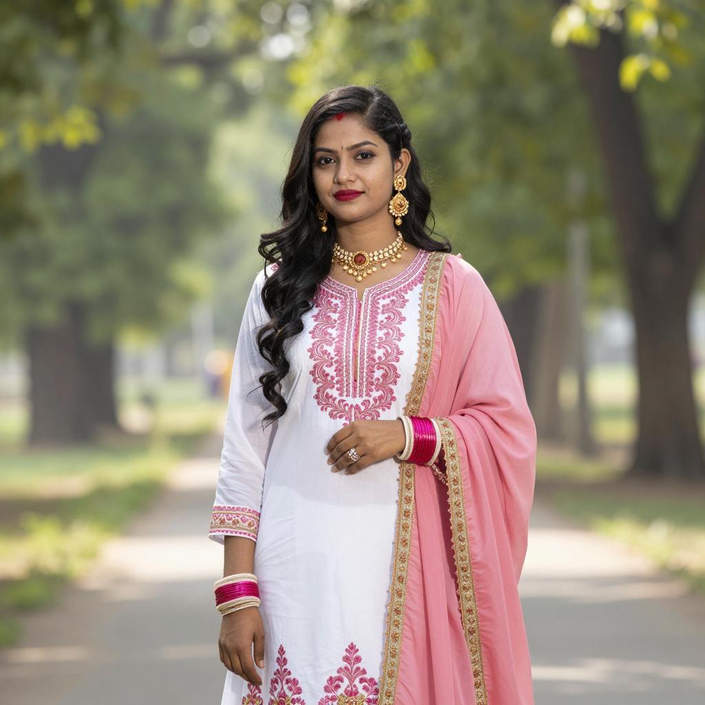 Portrait of a young Indian woman standing outdoors on a sunny pathway surrounded by greenery. She is dressed in a traditional white salwar kameez with intricate pink embroidery, complemented by a long pink dupatta with gold trim. She wears a gold necklace and matching earrings, along with pink and white bangles. Her long black wavy hair is styled in a side braid. The background features a soft-focus forest with sunlight filtering through the trees, creating a serene and colorful setting.