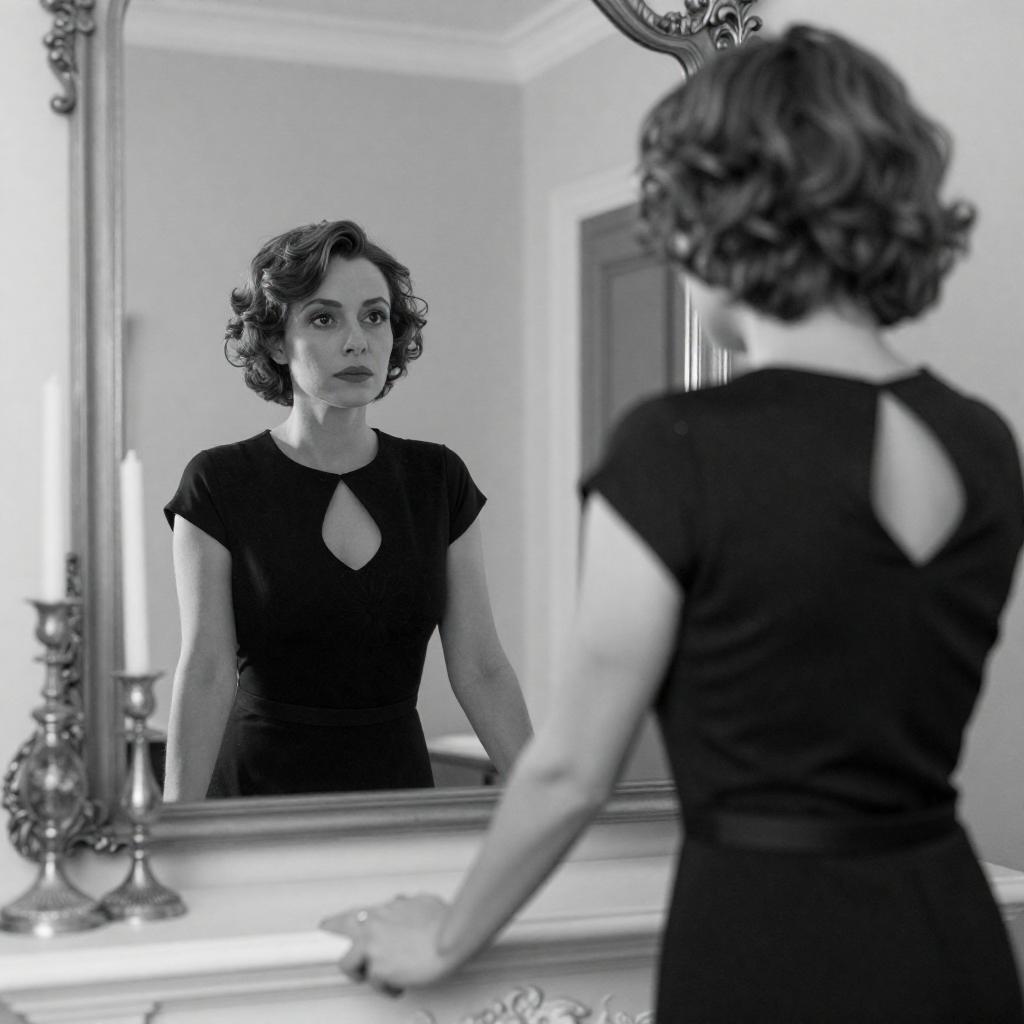 Black and white photograph of a vintage living room featuring a stern woman in a dark dress and wide-brim hat standing with hands on her hips. A bald man reclines in a patterned armchair with his eyes closed, while a third man with dark hair sits in the background. The room includes ornate curtains, a lit table lamp, a fireplace with a round mirror above it, and a round wooden table holding a cup, bowl with fruit, and plates.