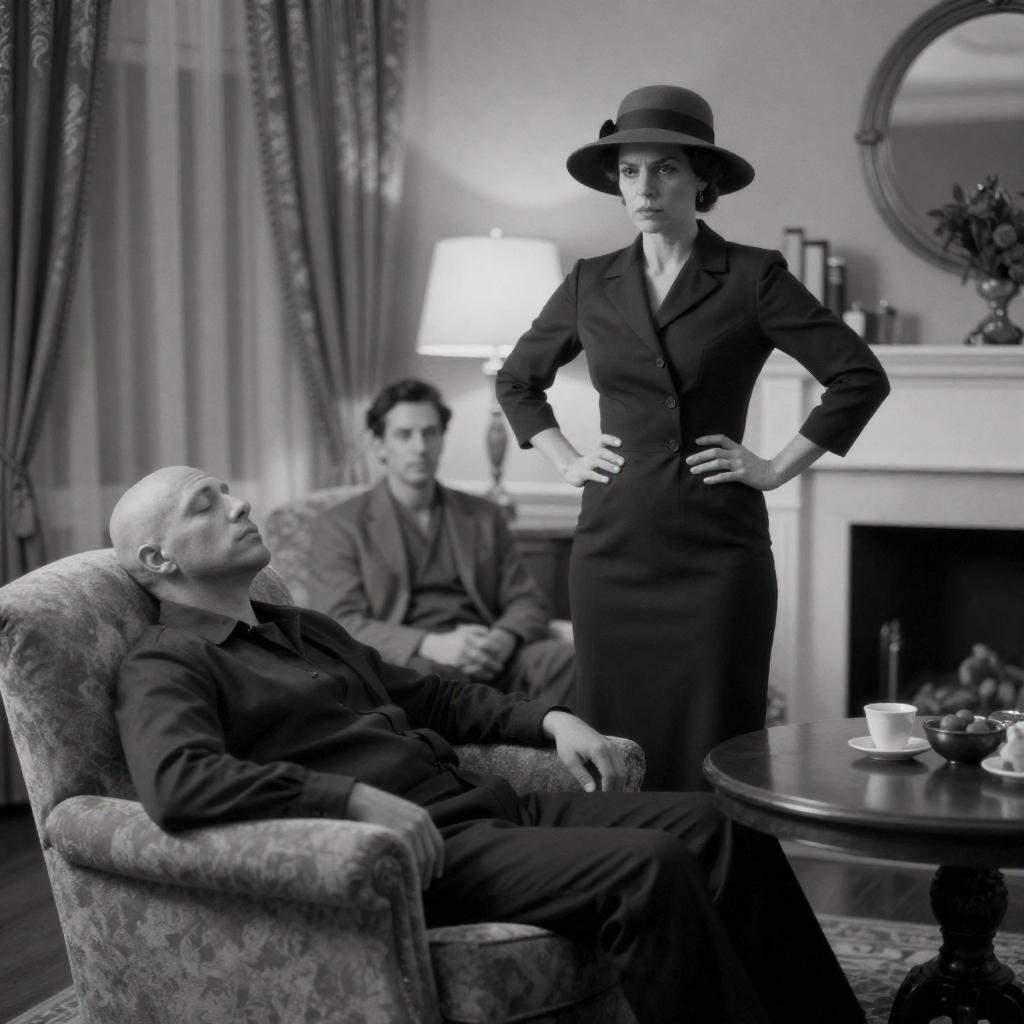 Black-and-white photograph of a living room scene. A stern woman in a dark dress and hat stands with hands on hips. A man reclines in an armchair, eyes closed. Two men sit on a round table, one bald, one with dark hair. Ornate curtains, fireplace, and lamps in background. Woman's expression intense.
