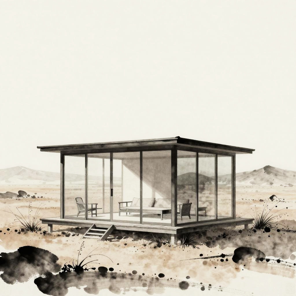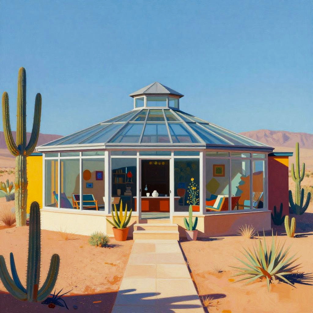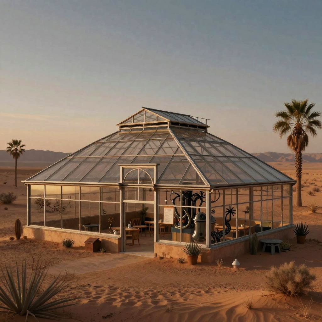 Full color illustration, a sunken desert greenhouse on a ranch in the desert, in the style of bio-mechanical surrealism, diffused twilight glow, highest quality, ultra sharp, h.r. giger inspired, ultra detailed, dark mysterious tones, misc-geometric