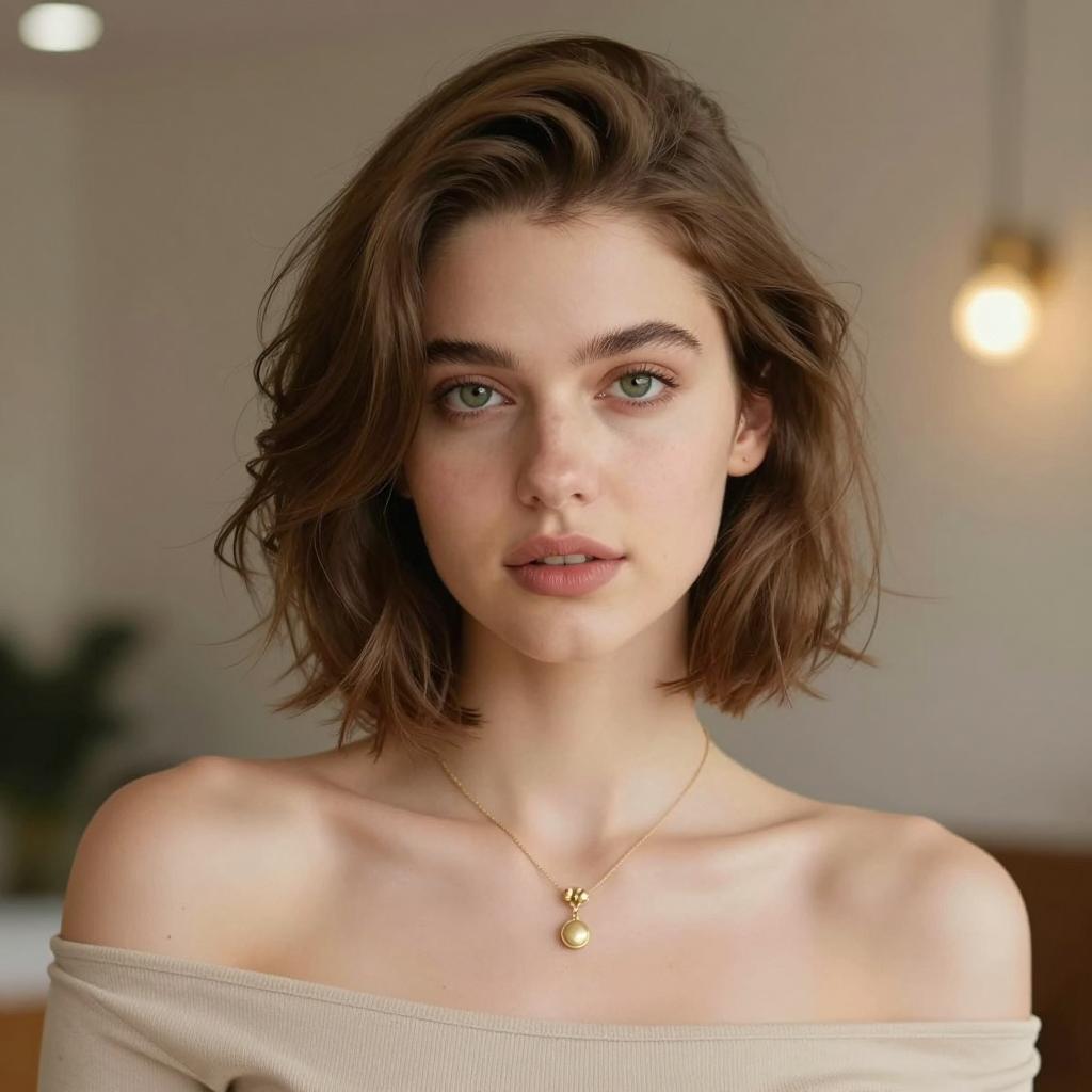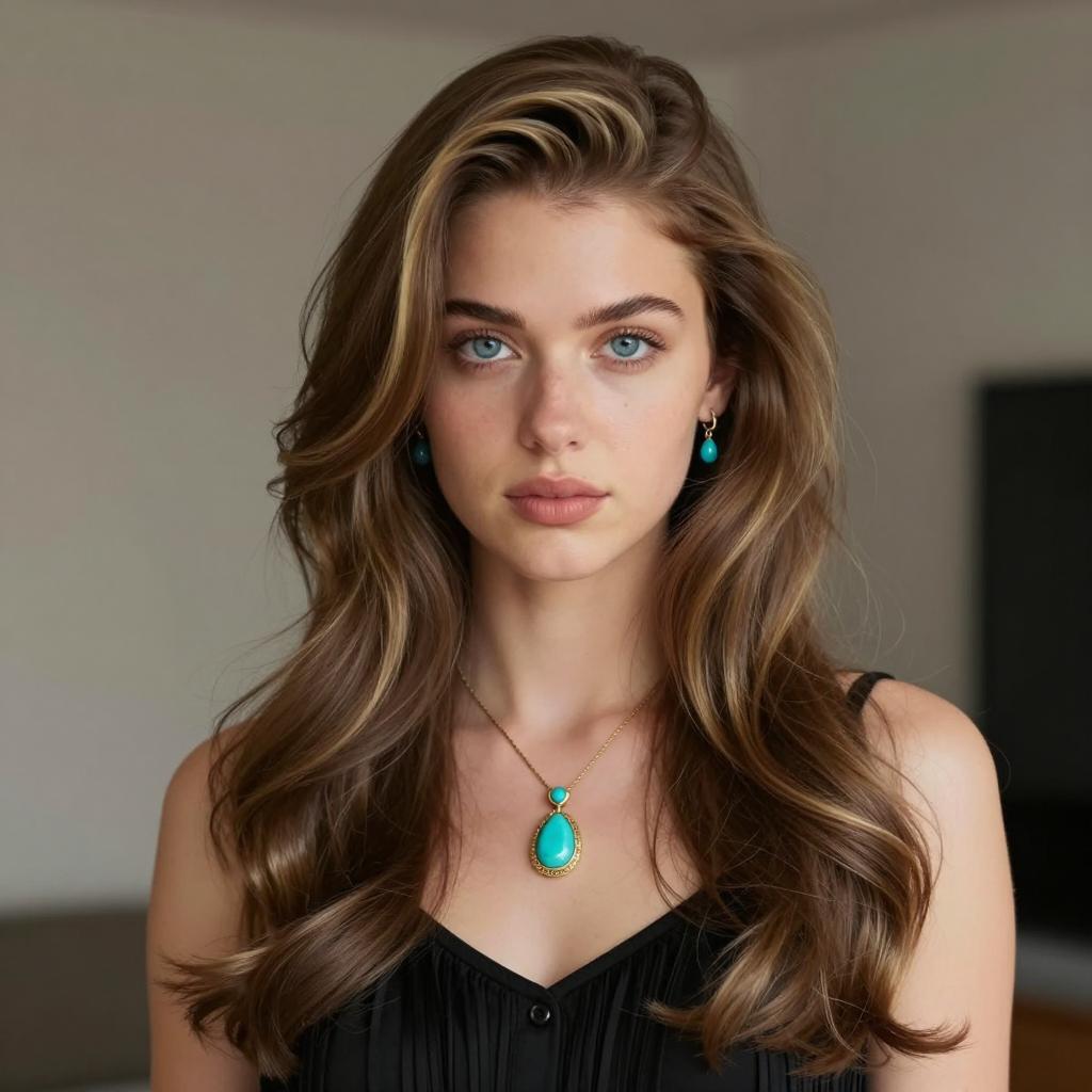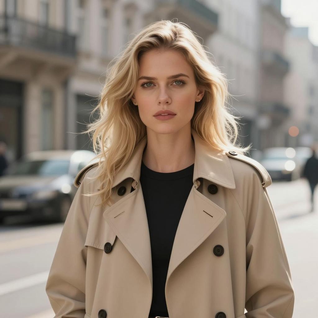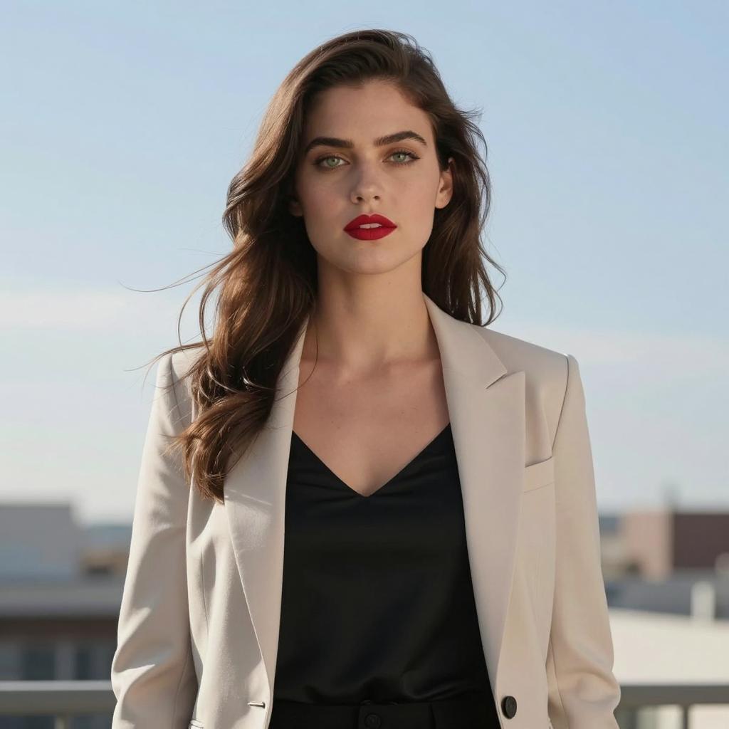 Photorealistic portrait of a young woman with long brown hair and green eyes wearing red lipstick. She is dressed in a black V-neck top and a light beige blazer. The image features a soft sunlight effect with a clear blue sky and blurred urban background, emphasizing a modern and natural setting with shallow depth of field.