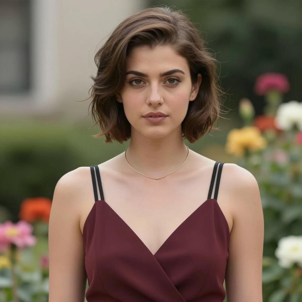 Alex delarge costume female, photorealistic portrait of a beautiful young woman, long brown hair, green eyes, red lipstick, wearing a black V-neck top and a light beige blazer, clear blue sky in the background, soft sunlight, slight bokeh effect, realistic ures, medium shot, front-facing, natural light, shallow depth of field, modern urban setting, realistic style, highly detailed
