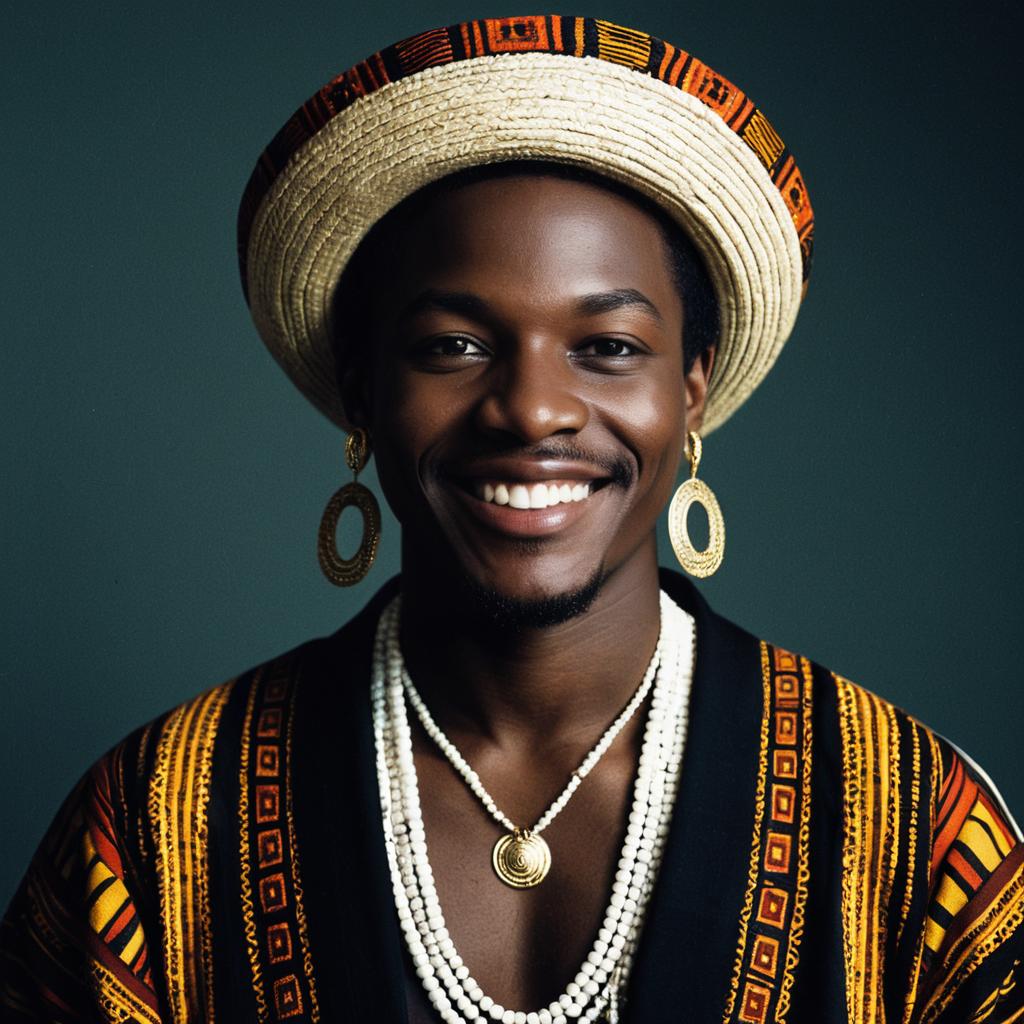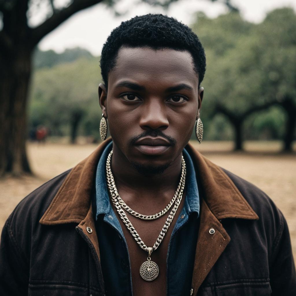 Portrait of a dark-skinned Black man wearing layered silver necklaces and large ornate earrings. He is dressed in a brown jacket over a dark shirt, standing outside in a natural setting with blurred trees and foliage in the background. The focus is on his upper body and face as he looks directly at the camera during the daytime.