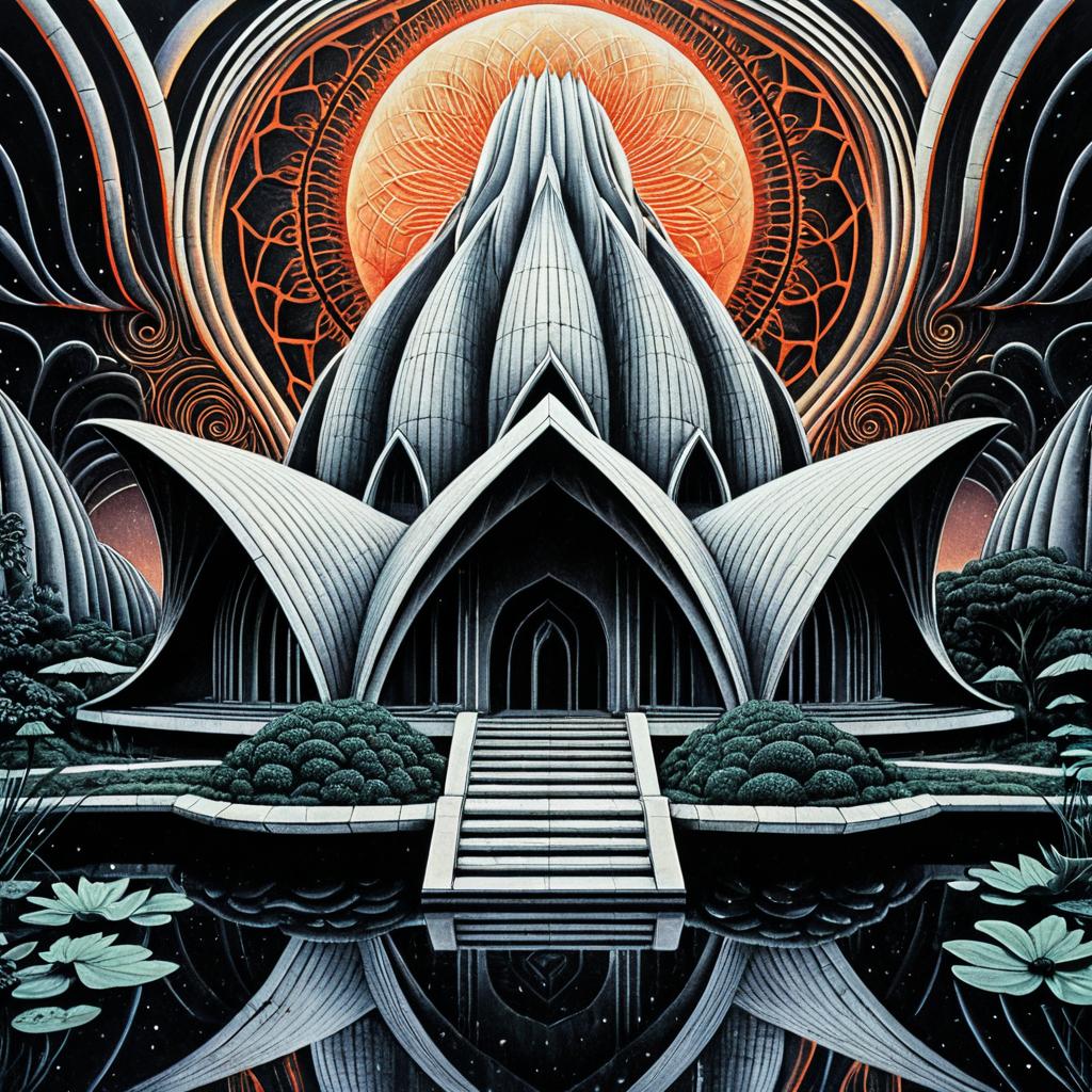 70s afrofuturist biomorphic design featuring a organic floating lotus temple. Styled in intricate op-art details by H.R. Giger, Alex Grey, and James Gurney in 8K.