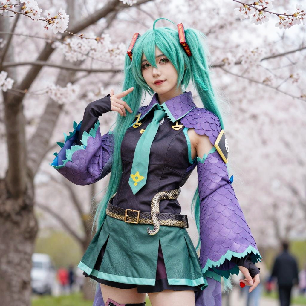 A woman with teal hair styled in twin ponytails and adorned with red hair accessories poses outdoors amidst blooming cherry blossoms. She wears a striking costume featuring a purple scaled cape, a black top, a green pleated skirt, and a snake-patterned belt, embodying a detailed cosplay look inspired by Japanese anime or manga styles.