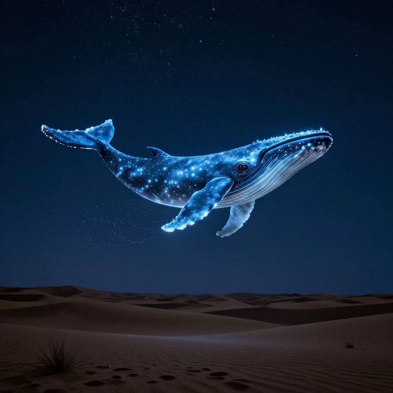 Glowing blue holographic whale swims through a star-filled night sky over a dark desert dune landscape. Digital artwork.