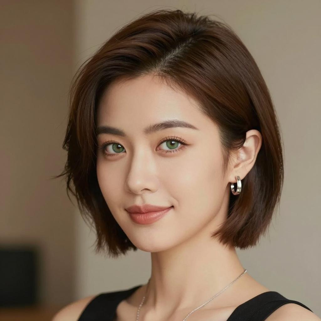 Photorealistic close-up portrait of a young Asian woman with light skin and dark brown hair styled in a bun, wearing a silver headband. She is dressed in a brown V-neck dress with puffed sleeves and accessorized with a silver starburst pendant necklace and matching dangling earrings. The image features soft natural lighting against a blurred gray background, highlighting her subtle makeup and calm, elegant expression.