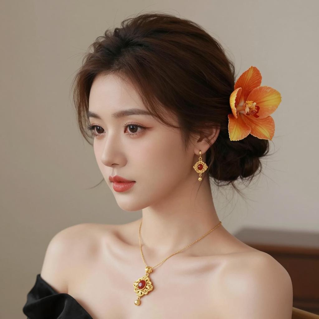 Short straight headband, photorealistic portrait of a young woman, Asian, light skin, dark brown hair, hair in a bun with a silver headband, wearing brown V-neck dress with puffed sleeves, silver necklace with starburst pendant, matching silver dangling earrings, soft natural light, blurred gray background, subtle makeup, calm expression, close-up, upper body, elegant, classy, realistic details, high-quality ure, portrait photography style