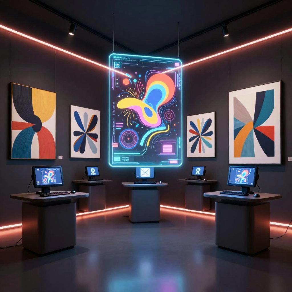 Photograph of a modern art gallery with neon-lit abstract paintings, colorful digital displays, and laptop screens on round tables.