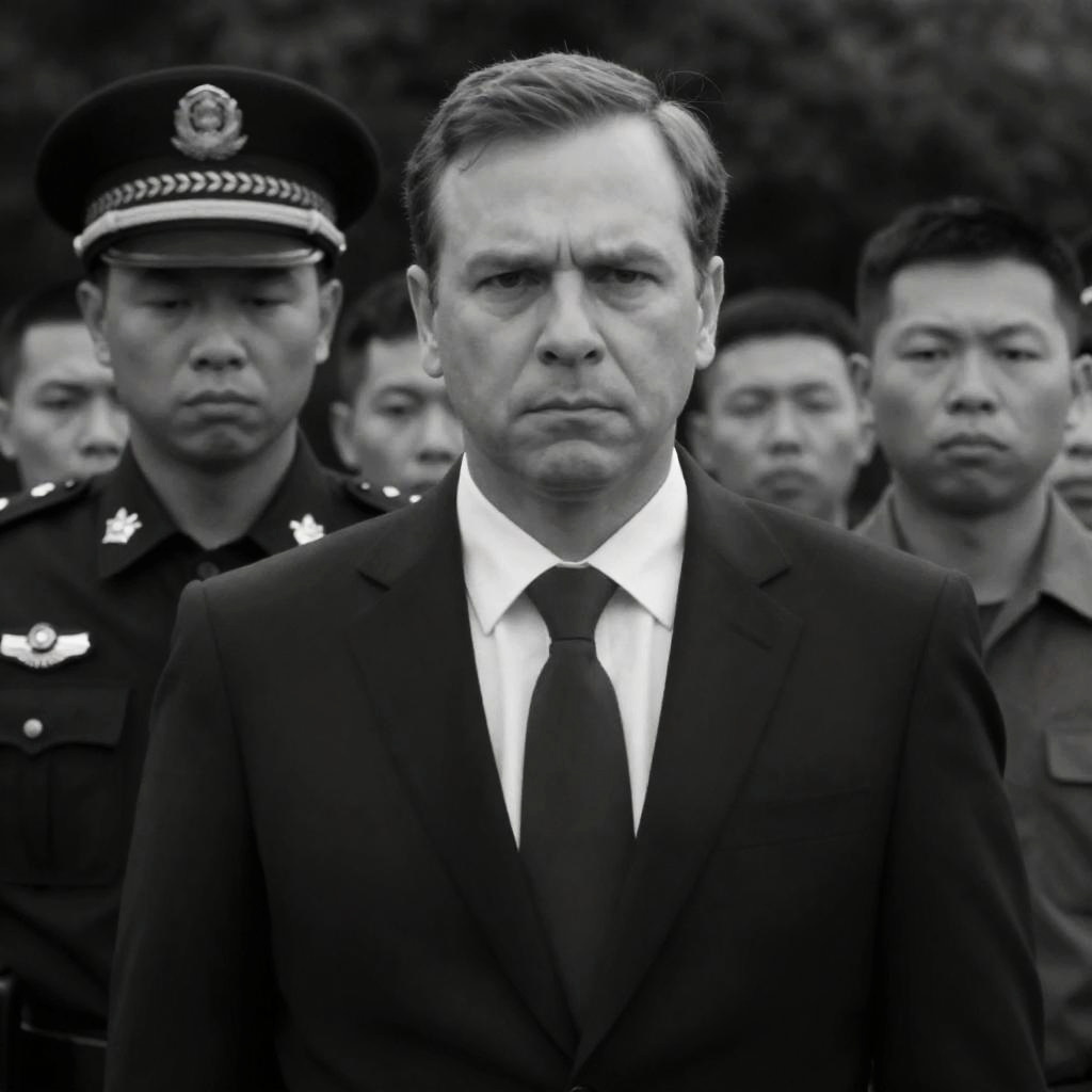 Black-and-white photograph of a serious middle-aged white man in a suit with a dark tie, flanked by a Chinese police officer in a peaked cap and several Asian men in the background. The man in the suit has a stern expression, while the police officer looks down. The background is dark with indistinct foliage.