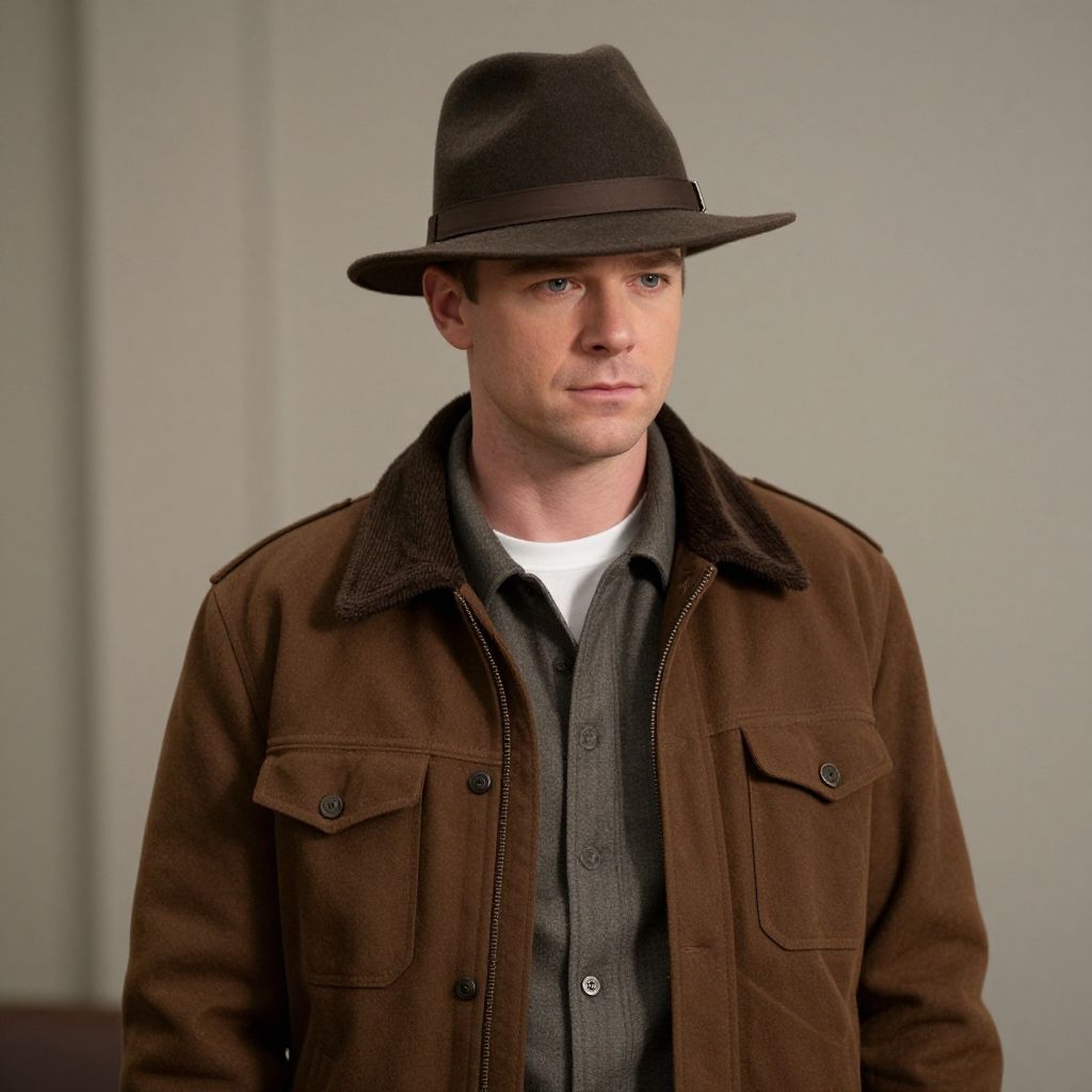 Photograph of a Caucasian man with fair skin, wearing a black fedora, brown jacket, gray shirt, and white tee, standing against a plain