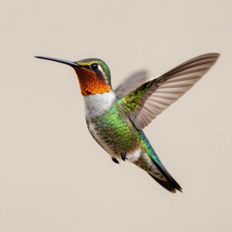 Vibrant hummingbird mid-flight showcases iridescent green plumage, a striking orange throat patch, and delicate wings spread wide against a soft beige background.