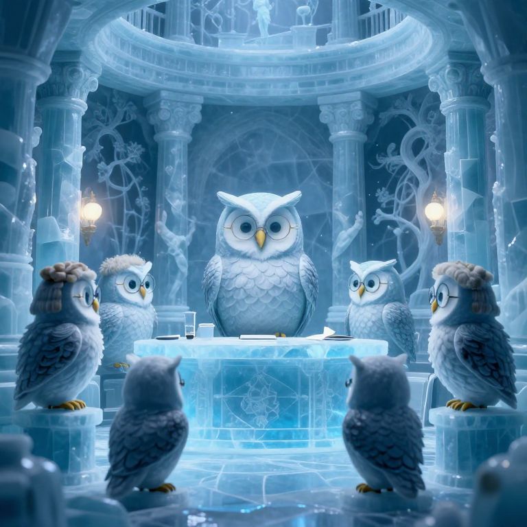 In a whimsical digital art rendering, a parliament of owls, adorned with tiny glasses and miniature wigs, solemnly debates the meaning of dreams within a chamber intricately carved from ice, illuminated by ethereal blue lighting.