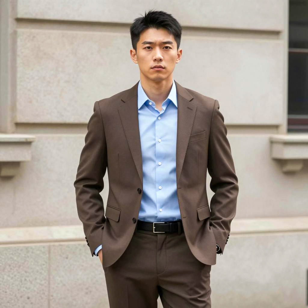 A man stands confidently in a tranquil garden setting, exuding a relaxed yet poised demeanor amidst lush greenery. His casual, artistic style is highlighted by the natural tones of his outfit, seamlessly blending with the serene bamboo backdrop.