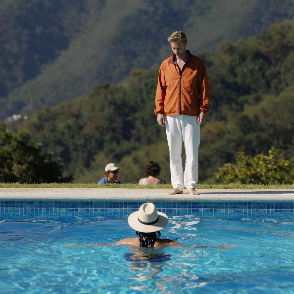 Photograph of a pool scene. Blonde man in orange jacket and white pants stands by the pool's edge, looking down. A person with dark hair and a sunhat swims in the clear blue pool. Mountainous forest background. Sunlight casts shadows. Man's expression is neutral. Two people. Pool with tiled edge.