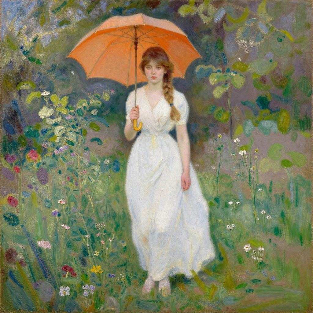 Digital painting of a young woman with long brown hair in a white dress holding an orange umbrella, standing in a vibrant, colorful garden with lush greenery