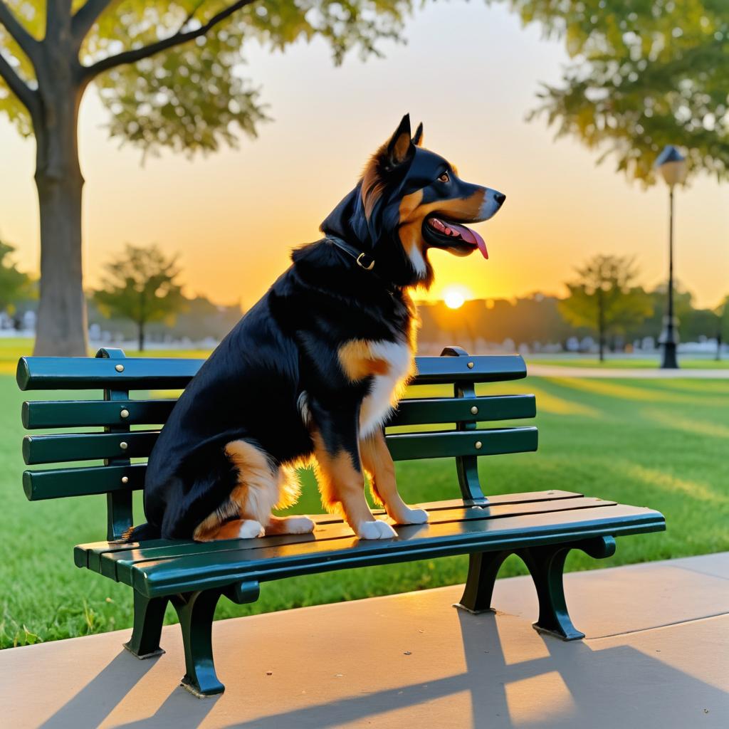 Dog Sitting on Park Bench at Sunset