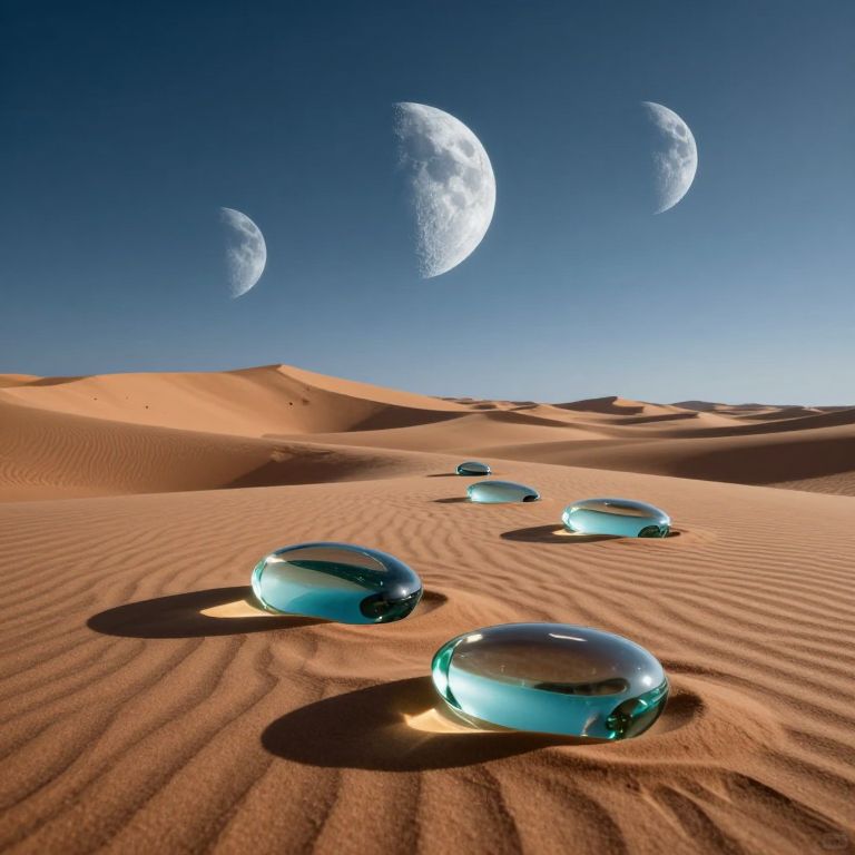 Photorealistic digital artwork of a desert landscape under a clear, deep blue sky with three crescent moons. The foreground features five transparent, blue-tinted glass orbs lying on rippled, golden-brown sand dunes. The orbs reflect the moonlight and the surrounding desert. The background shows gently rolling sand dunes extending to the horizon, with the bright moonlight casting soft shadows on the sand. The glass orbs are scattered at various angles, creating a dynamic composition against the serene desert backdrop.