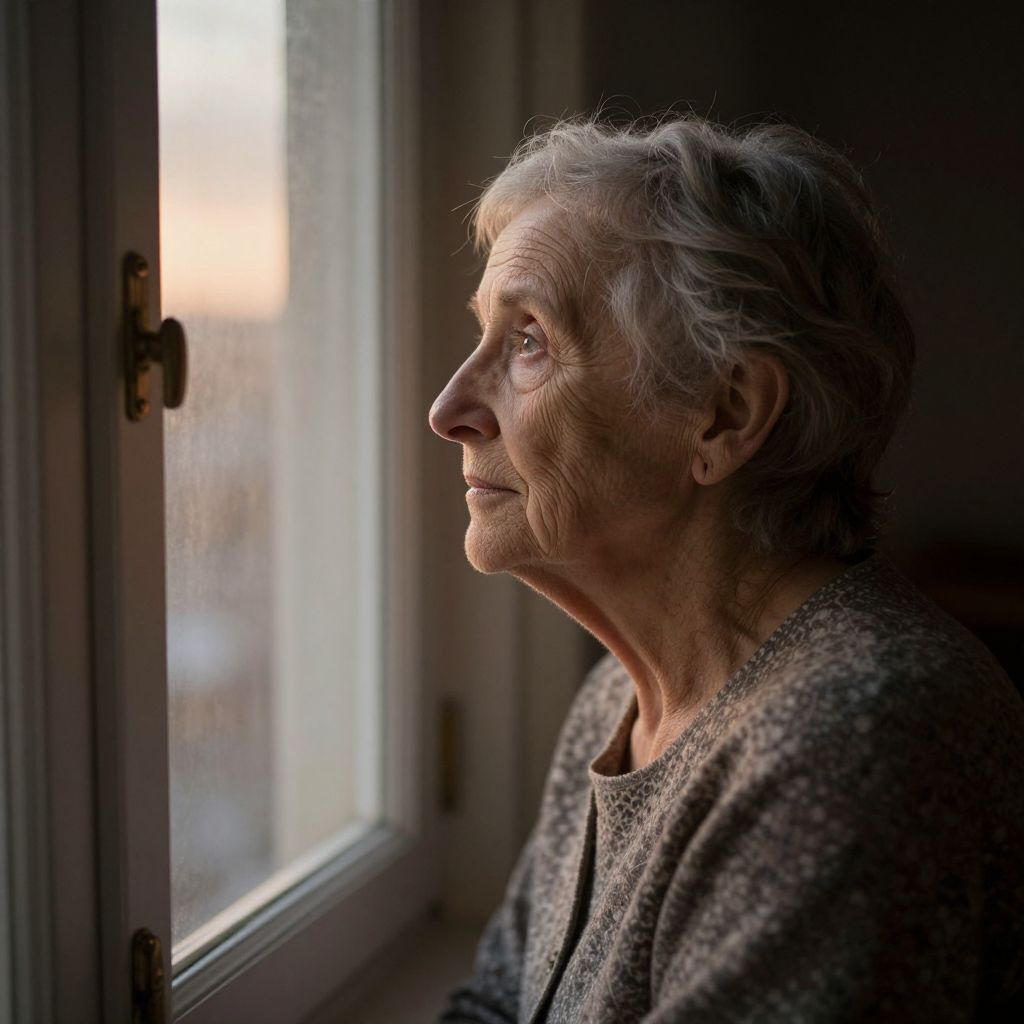 Photograph of an elderly woman with short white hair, wearing a gray textured sweater, gazing out a window, bathed in soft sunlight.