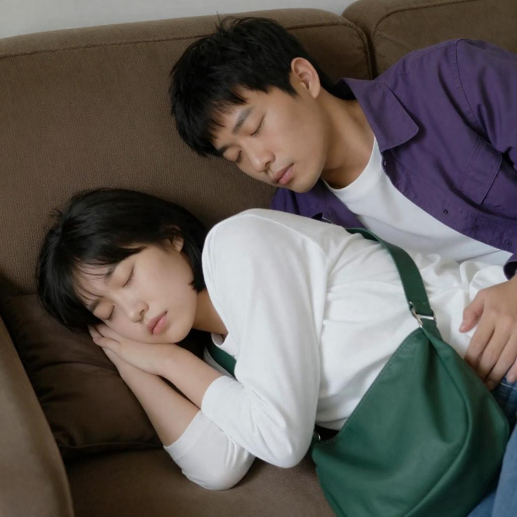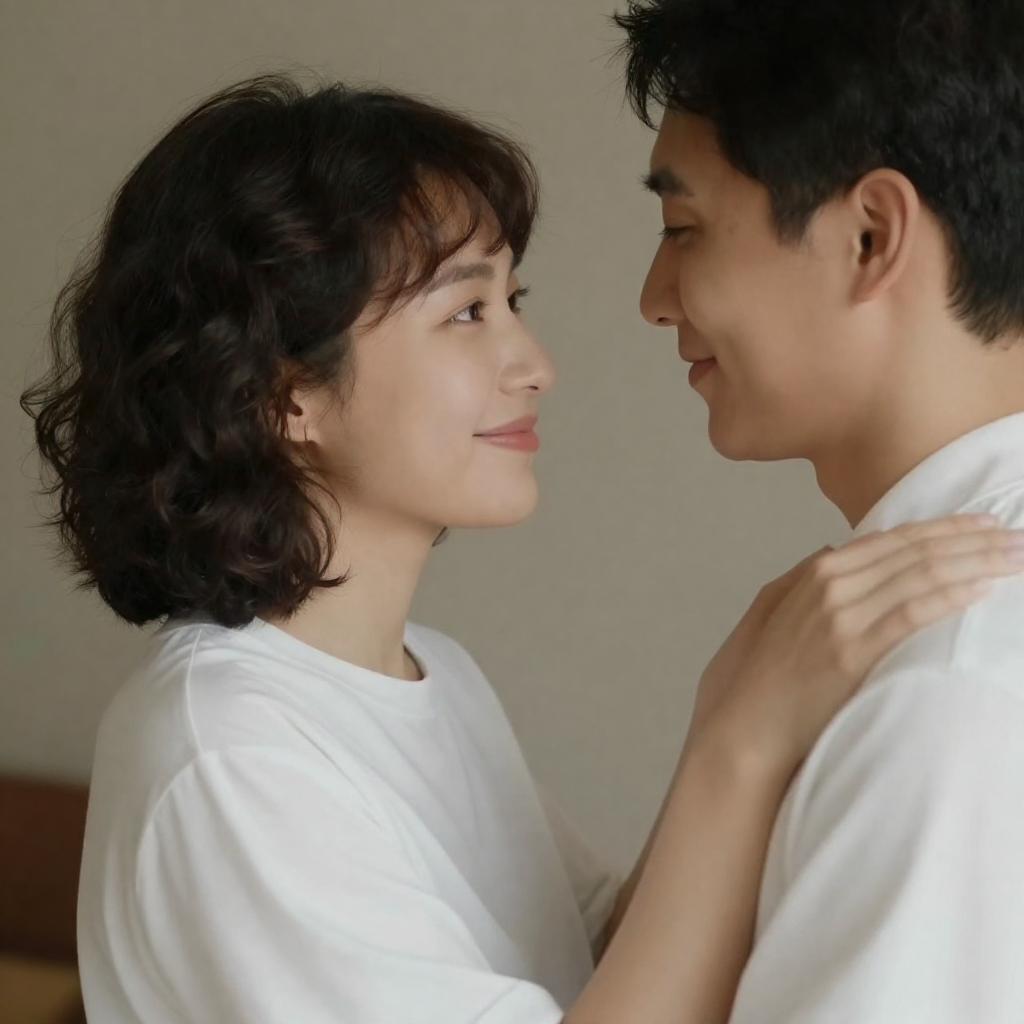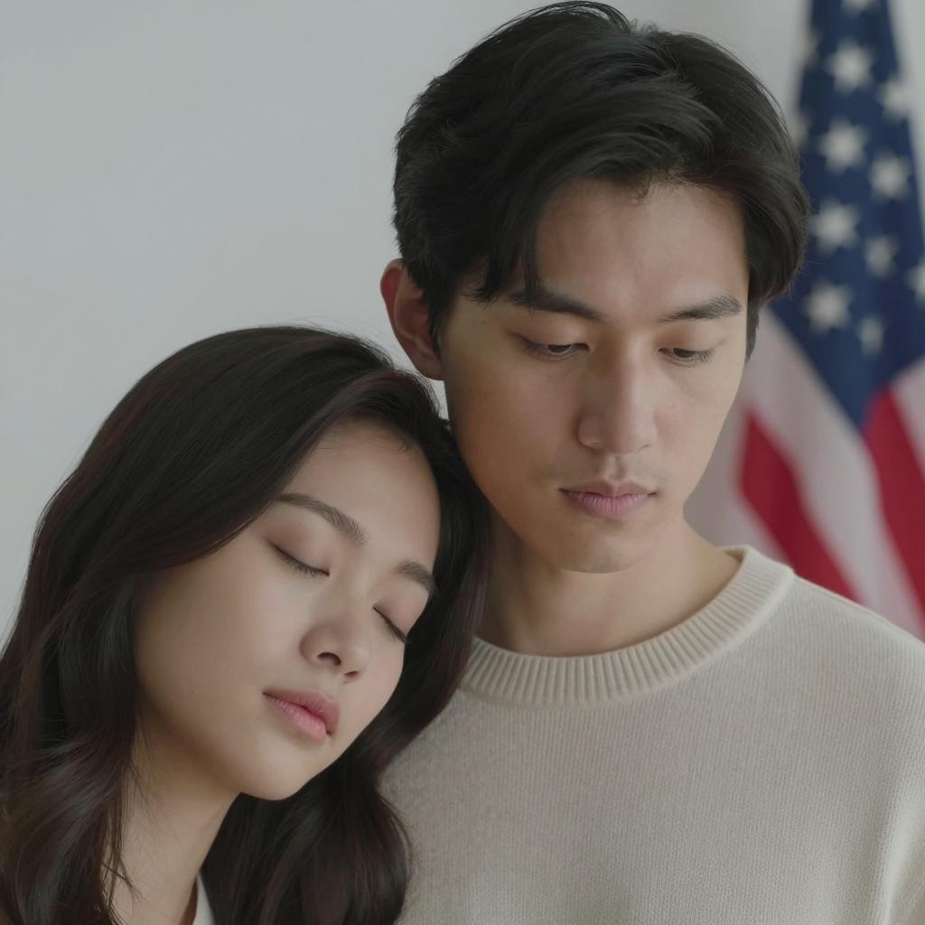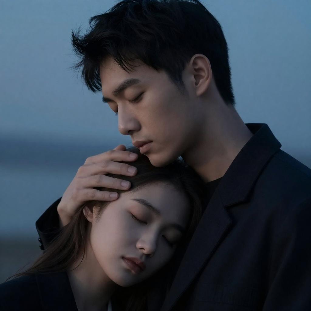 Photograph of an Asian man and woman in an embrace. Woman with closed eyes, pale skin, black hair, white shirt, red lipstick. Man with short black hair, eyes partially closed, behind her. Green-tinted background with blurred objects. Woman's head rests on man's shoulder. Man's arms wrap around her. Intimate, emotional moment.