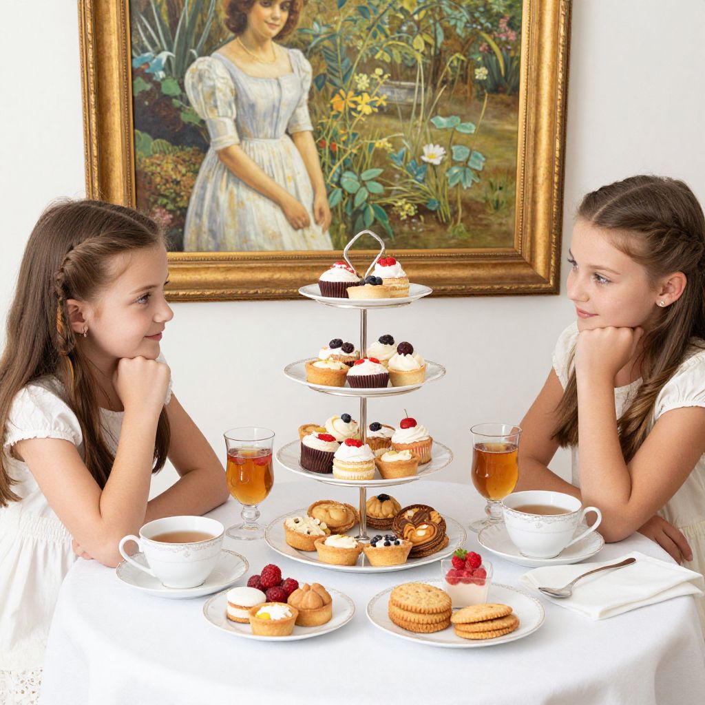 Two young girls enjoy a delightful afternoon tea party, surrounded by a tiered stand filled with three tiers of assorted pastries, including cupcakes, tarts, and cookies, alongside cups of tea, fruit, and small desserts, all set on a pristine white tablecloth beneath a framed painting of a woman in a garden.
