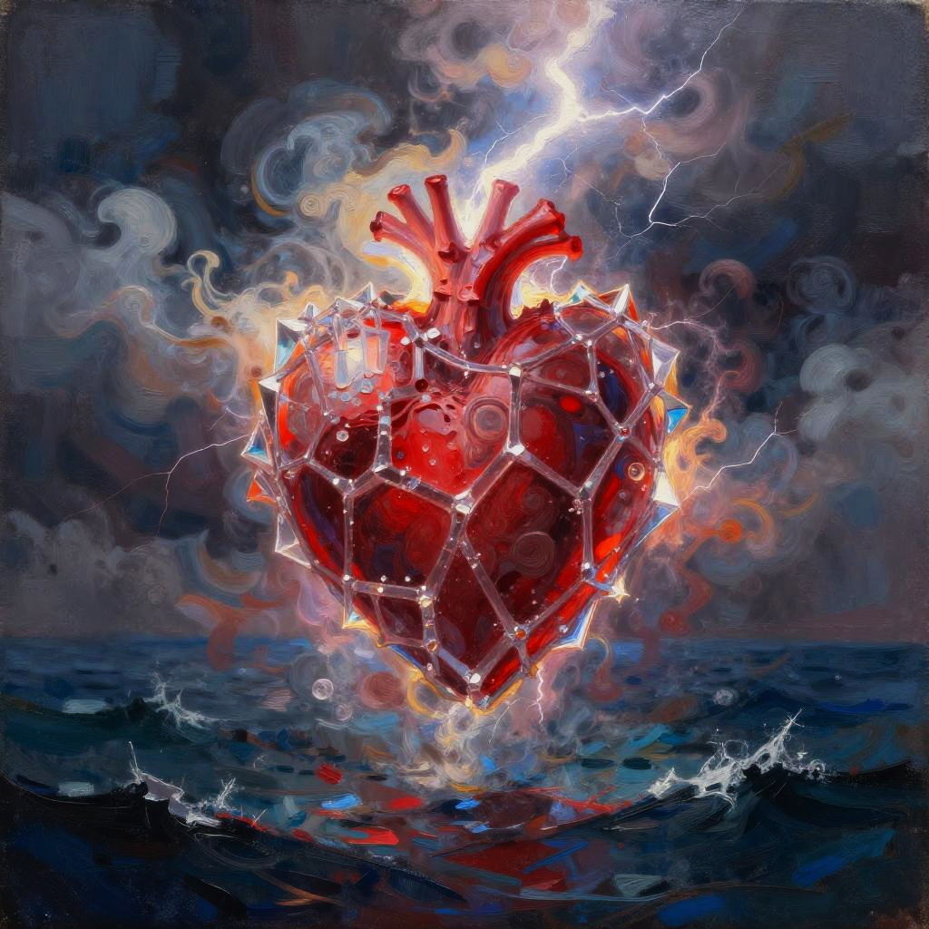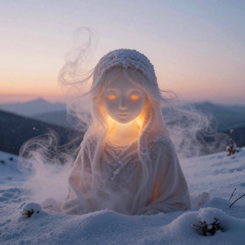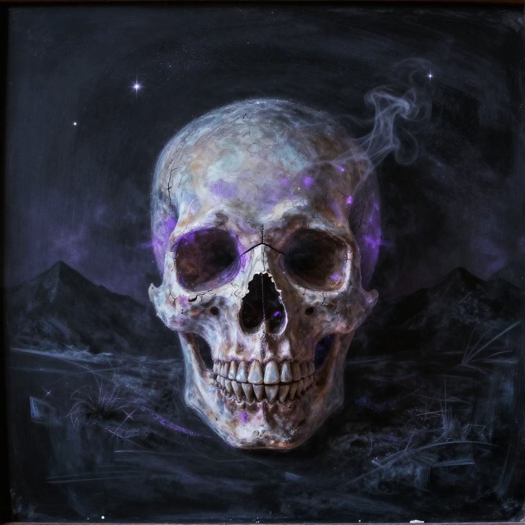 A textured pastel chalk on blackboard centered on a cracked crystal skull emanating faint violet light within a desolate mountain plateau against a tumultuous star-filled night sky. The glow burns through the haze, carving dramatic rim light and making nearby forms translucent. Volumetric smoke, soft bloom, warm–cool contrast, fine texture detail, negative space, gentle vignette. Eerie, melancholic atmosphere with suspended motion and subtle grain.