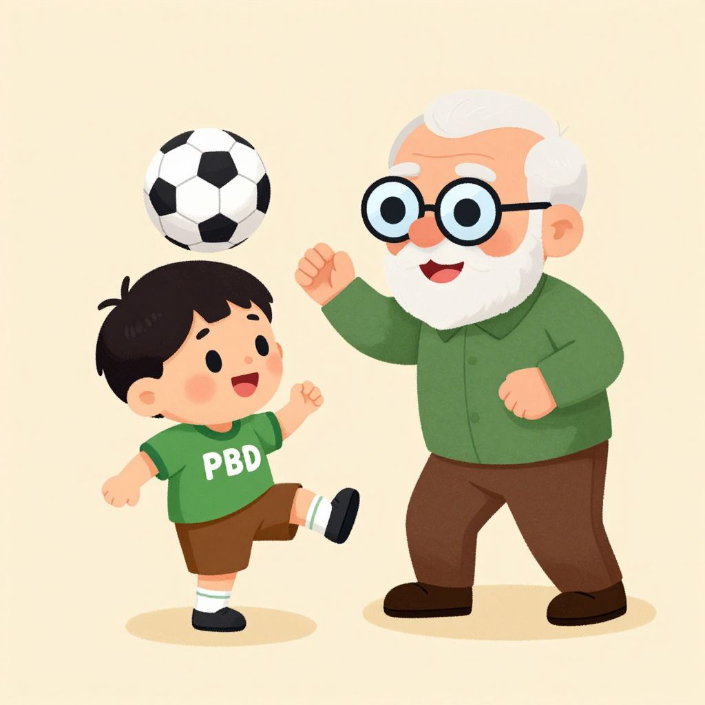In this charming illustration, an elderly man with a warm smile and a white beard, wearing glasses and a green shirt, is joyfully engaged in a game of soccer with his young nephew. The man's glasses have a unique design, with the lenses shaped like a soccer ball. The boy, dressed in a green shirt with the letters \"PBD\" and brown shorts, is energetically kicking a soccer ball that hovers above his head. Both characters are depicted in a cute, cartoonish style with vibrant colors and soft textures, creating a sense of playfulness and innocence. The background is a simple, warm beige, which allows the characters and their actions to stand out prominently. The overall composition is balanced, with the man and the boy positioned in the center, their dynamic poses suggesting movement and interaction. The illustration captures a heartwarming moment of bonding and shared joy between the two generations, set against a minimalistic backdrop that keeps the focus on the characters and their activity.
