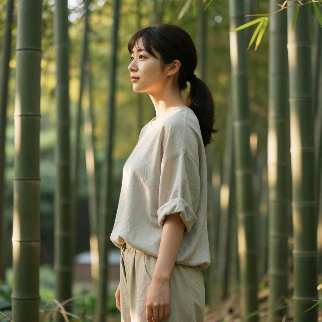 Japanese woman side profile, casual contemporary outfit, soft pastel color palette, standing in a peaceful bamboo forest under golden hour light, highly detailed lifelike portrait