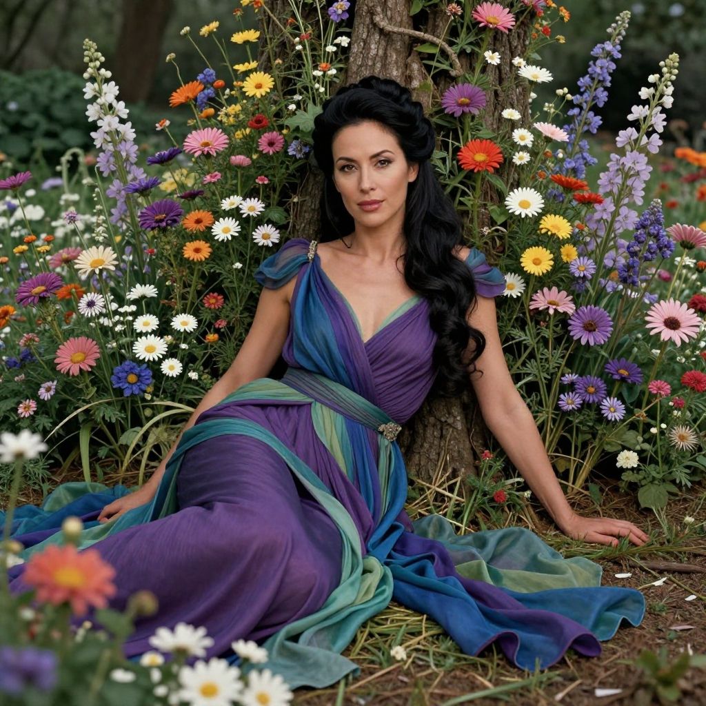 ((masterpiece, best quality, highres, realistic)) Perfect Face, Create a digital portrait of a confident and elegant adult woman, surrounded by lush, vibrant flowers that seem to grow and bloom around her. The woman should be depicted in a relaxed, natural pose, perhaps leaning against a tree or sitting on a bench, surrounded by a garden or forest floor covered in wildflowers. The woman should be dressed in flowing, elegant clothing that drapes gracefully around her body, perhaps in shades of purple, blue, or green that complement the colors of the flowers. Her hair should be depicted as luscious and healthy, perhaps cascading down her back or styled in an intricate updo. The flowers surrounding the woman should be rendered in exquisite detail, with each petal and leaf carefully crafted to create a sense of depth and texture. The flowers should be in various stages of bloom, with some still budding and others fully open, creating a sense of movement and growth. The overall mood of the piece should be one of serenit
