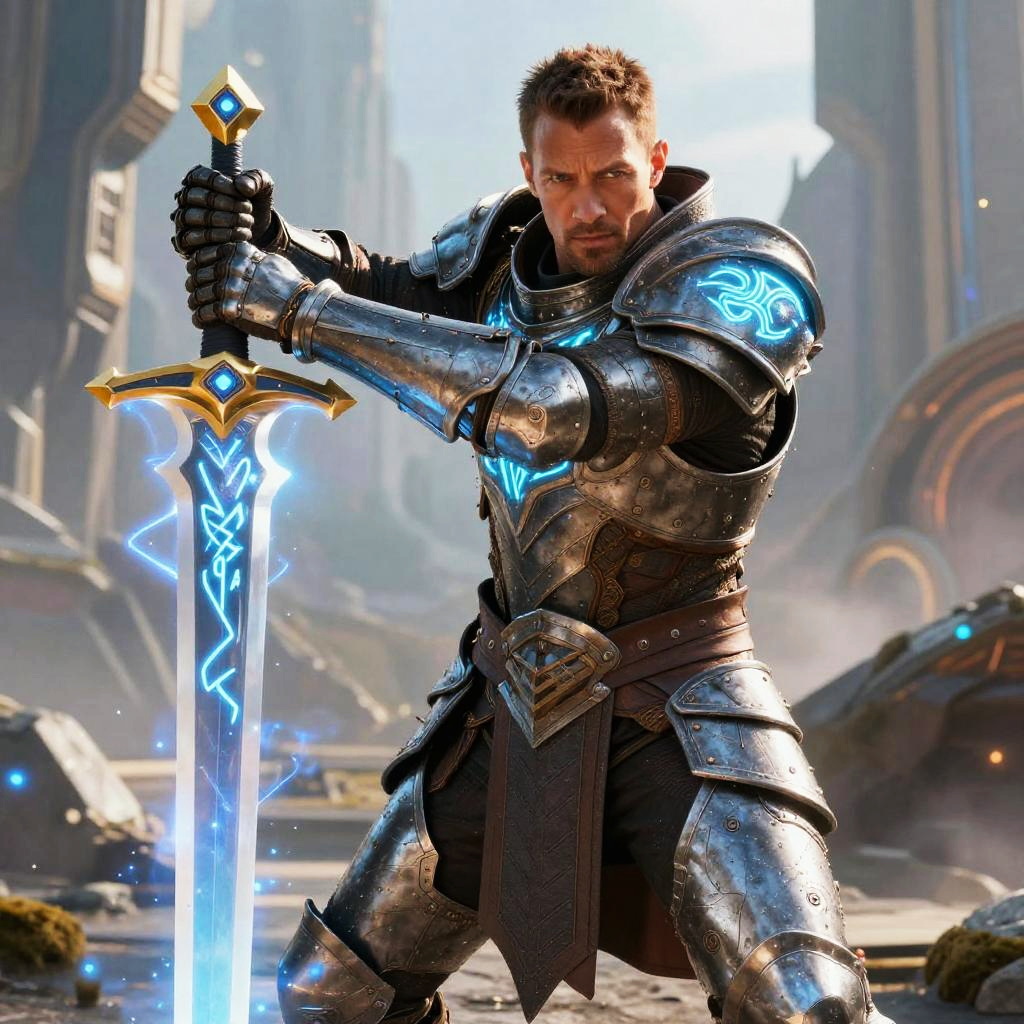 Photorealistic CGI of a muscular, determined man in glowing blue-embellished silver armor, gripping a blue, electrically charged sword, standing