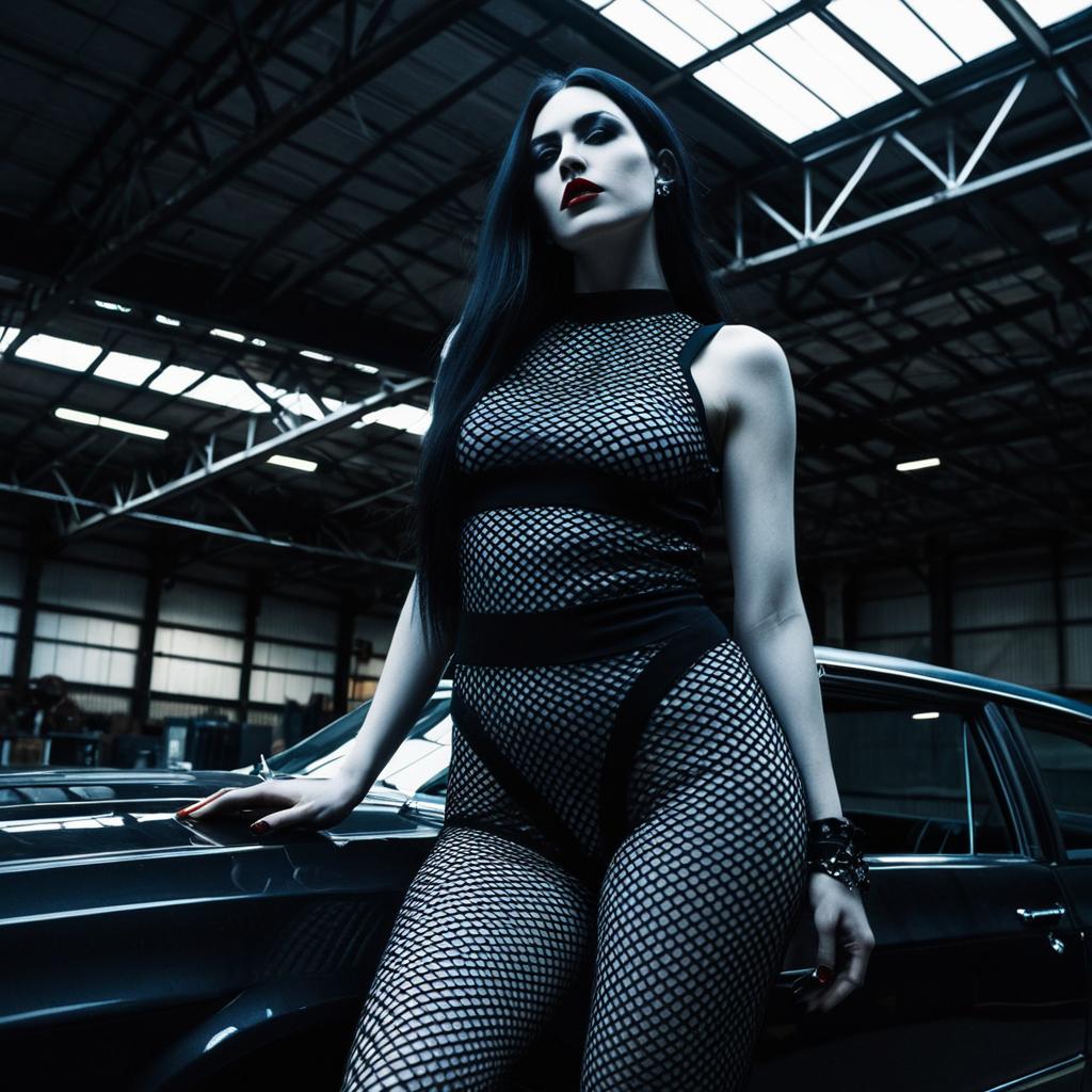 Fit woman wearing sheer fishnet gothic dress layered over matching bodysuit in dark violet-black with faint purple glow on tall pale-skinned figure with long straight black hair and bold red lips posed leaning slightly forward with one hand on a car and the other raised in dark industrial warehouse with exposed ceiling beams and metal structures, moody side lighting with subtle teal rim light, high-fashion editorial photography, low angle, intense atmosphere, high resolution, ultra-detailed