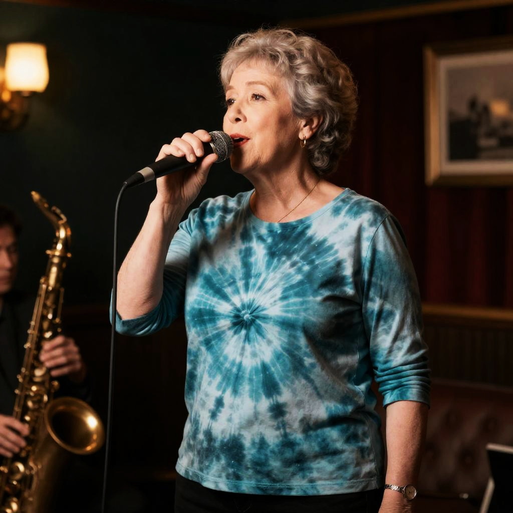 Retired jazz singer wearing an electric teal tie-dye shirt, standing in a vintage jazz club