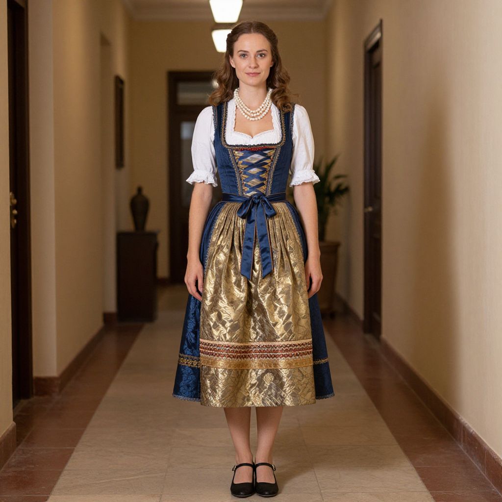 Bavarian female dress, woman in blue and gold dress standing in a hallway