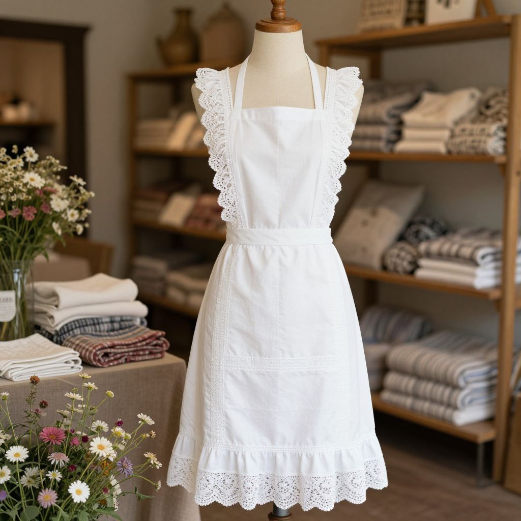 Elegant white pinafore apron with intricate lace and ruffles featured on a mannequin in a quaint countryside boutique, surrounded by handmade textiles and wildflowers, warm rustic tones, soft focus background, artistic and vintage aesthetic.