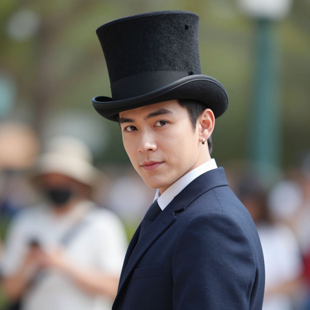 Photograph of an East Asian man in a black top hat and suit, looking over his shoulder, outdoor background with blurred people.