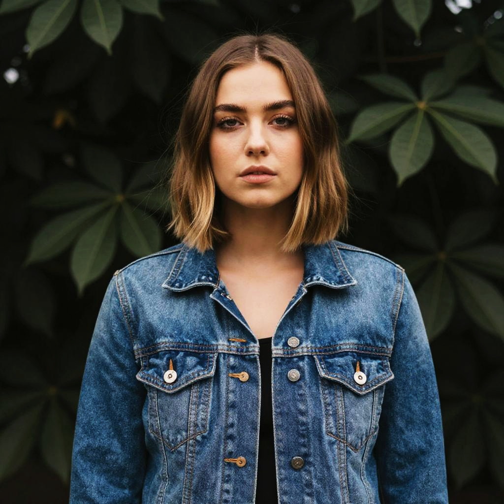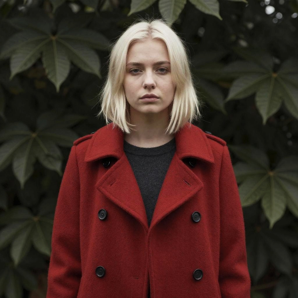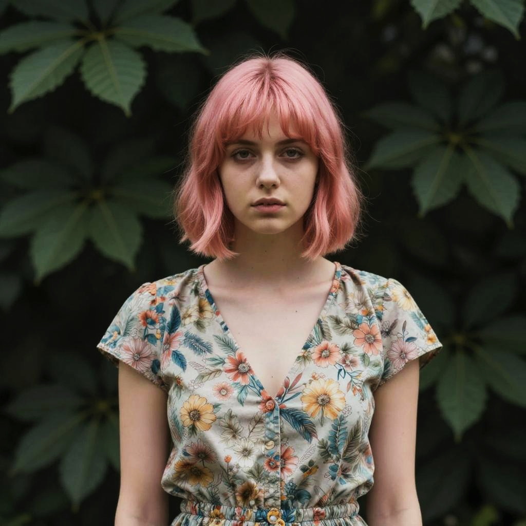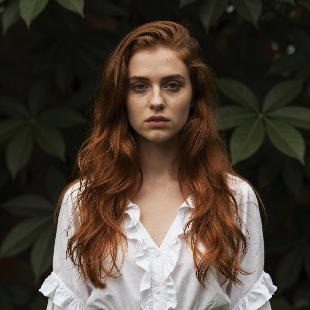 A moody portrait of a young woman with long voluminous auburn hair wearing a white cotton blouse with ruffles standing in front of a blurred green leafy background, soft natural lighting, shallow depth of field