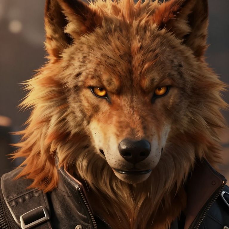 This is a highly detailed digital artwork of a realistic, anthropomorphic wolf with intense, glowing orange eyes and thick, reddish-brown fur. The wolf's expression is serious and focused. It wears a black leather jacket with a visible zipper, adding a modern, rugged touch. The background is blurred, featuring dark, muted colors that keep the focus on the wolf's face. The fur has a textured, slightly messy appearance, and the lighting highlights the wolf's fur and eyes, creating a dramatic, almost lifelike effect.