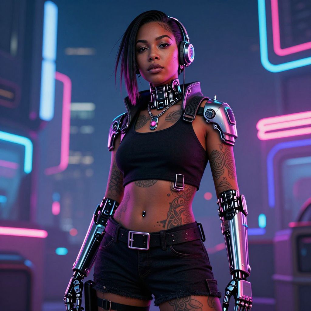Cyberpunk woman with black crop top, shorts, metallic arm and shoulder armor, tattoos, headphones, neon-lit futuristic city background. Photoreal