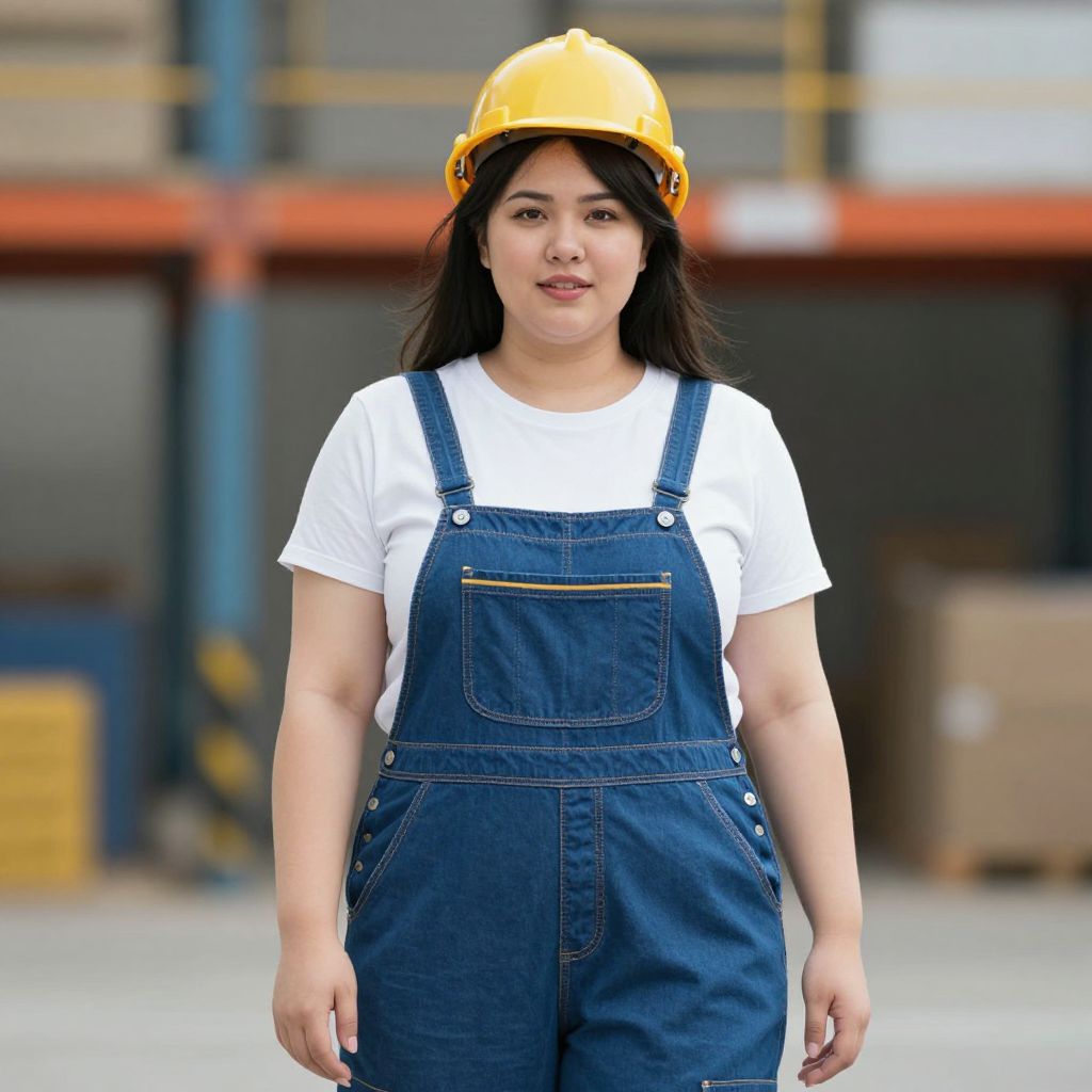 Photograph of an Asian woman with long black hair, wearing a yellow hard hat, white t-shirt, and blue denim overalls, standing in an