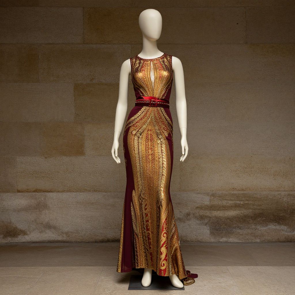 A mannequin wearing a gold and maroon gown with a red and gold pattern on it. The gown has a high neckline and a red belt. The mannequin is standing in front of a stone wall. The mannequin has a tall, slim figure with a confident posture, and the gown accentuates her curves with its intricate design. The red belt adds a bold statement to her ensemble, while the gold and maroon color scheme creates a striking contrast against the stone wall. The mannequin's expression is poised and elegant, exuding a sense of timeless beauty and sophistication.