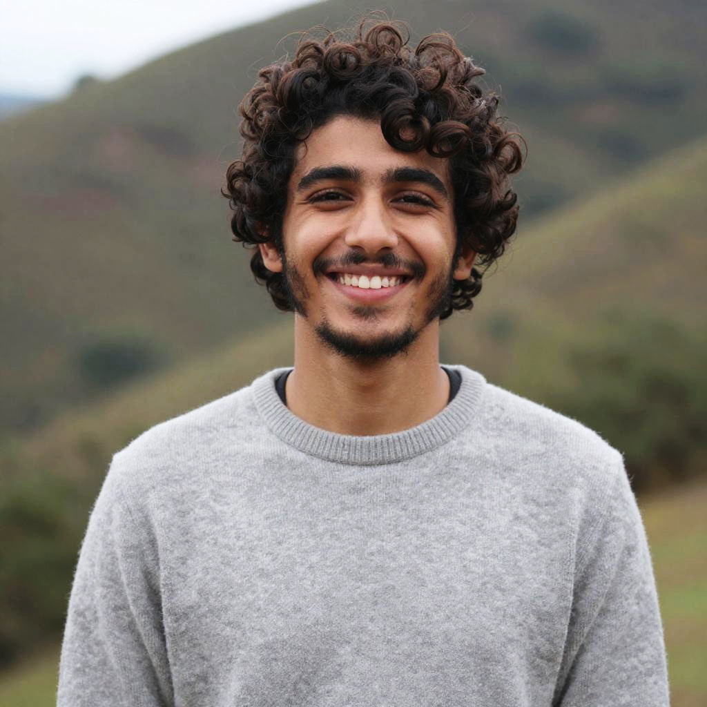 A candid portrait of a smiling young man with curly dark hair and stubble beard, wearing a light gray sweater, outdoors with a blurred natural hillside background under soft natural lighting, casual and relaxed atmosphere