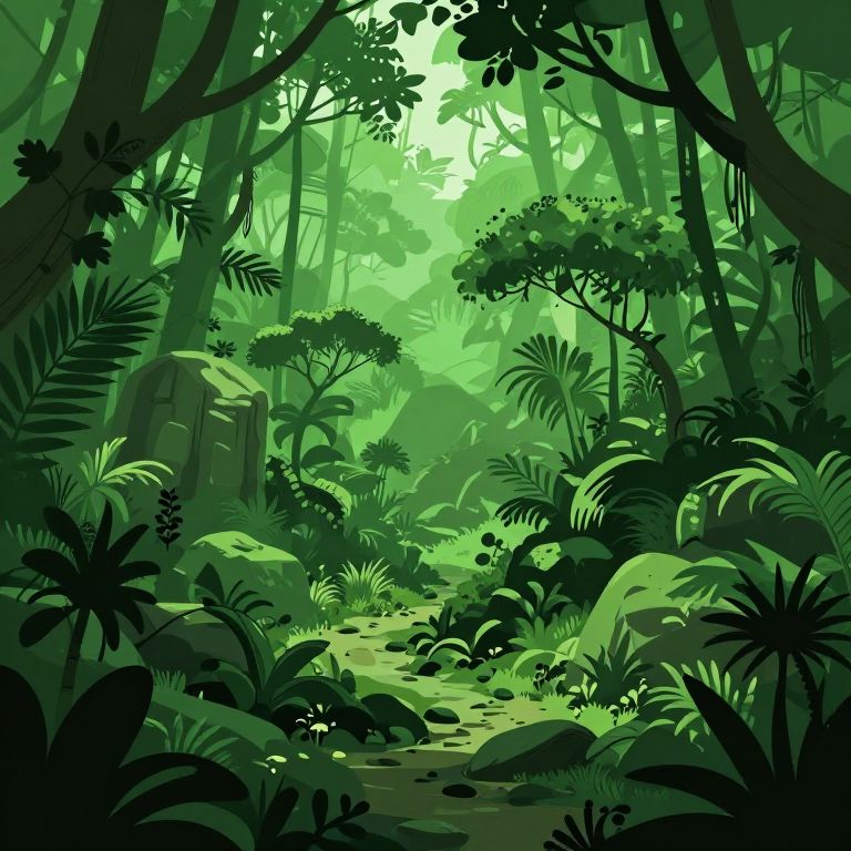 Digital illustration of a lush, green jungle with dense foliage, towering trees, and a rocky path winding through the underbrush. Light filters through the canopy