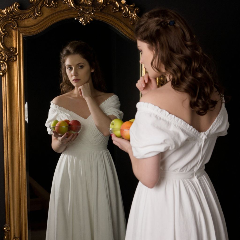 Woman in a white off-the-shoulder gown stands beside an ornate mirror, her reflection showing her contemplative pose as she gazes at herself while holding a bowl of fruit, framed by a golden border against a dark background.