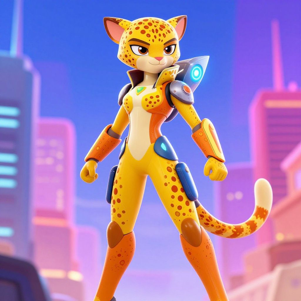 Stylized Cheetara costume for an animated sci-fi heroine, streamlined design with vibrant yellow and orange cheetah patterns, integrated high-tech gadgets, hovering urban skyline background, energetic and colorful, digital art.